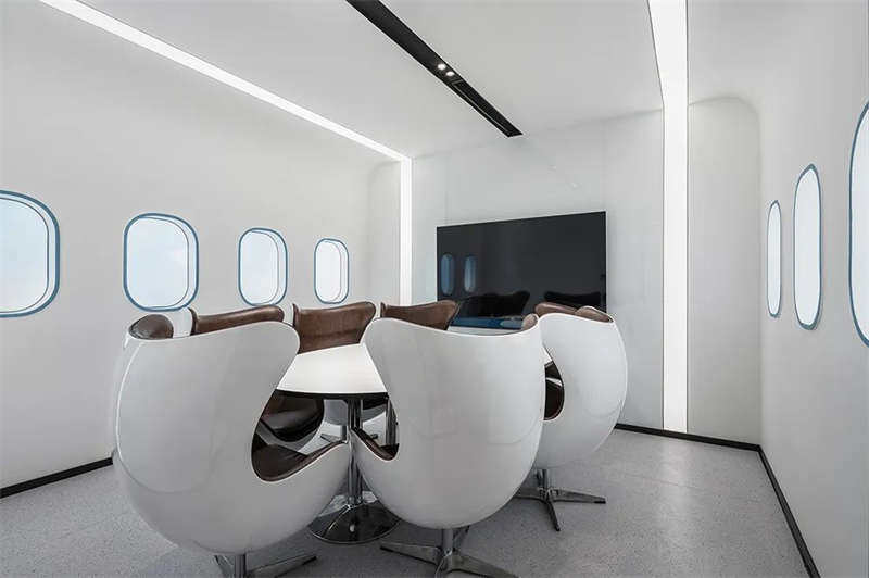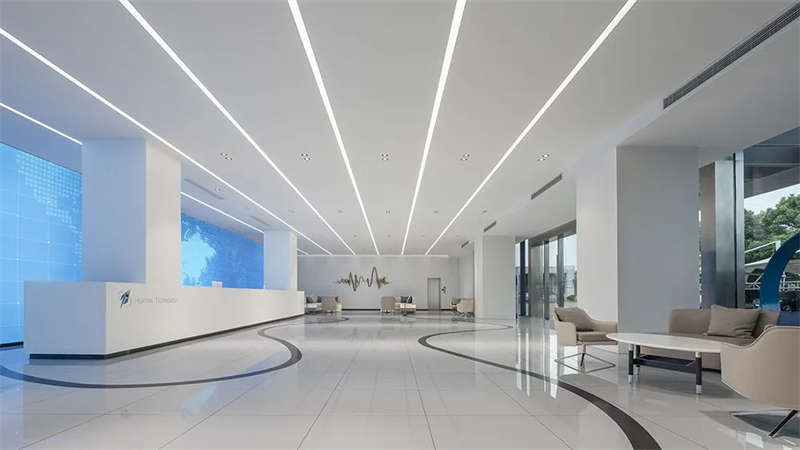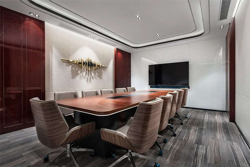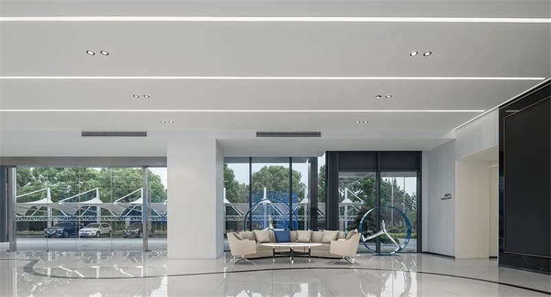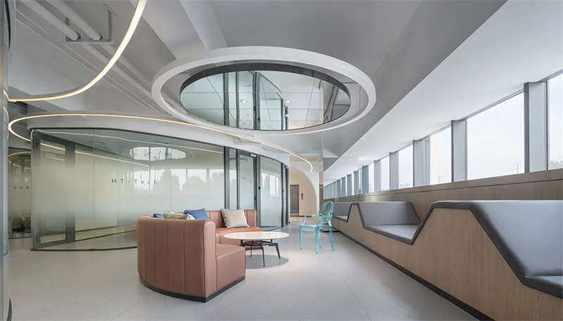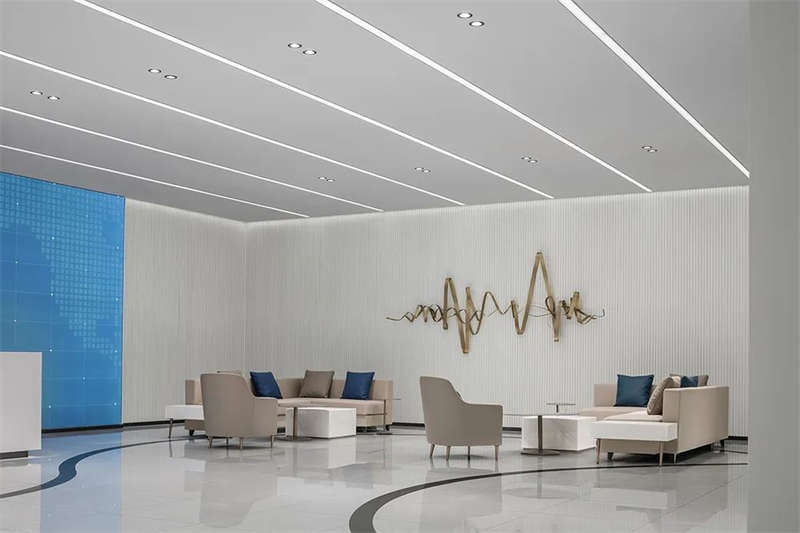 前廳頂部,鏡面質感與光帶反射,使空間得到延伸、重疊呼應,營造出多維的視覺效果,同時打破科技辦公室設計的刻板印象,擁有寬敞開放的前臺設計、待客區(qū),層次、質感、豐滿而厚重。