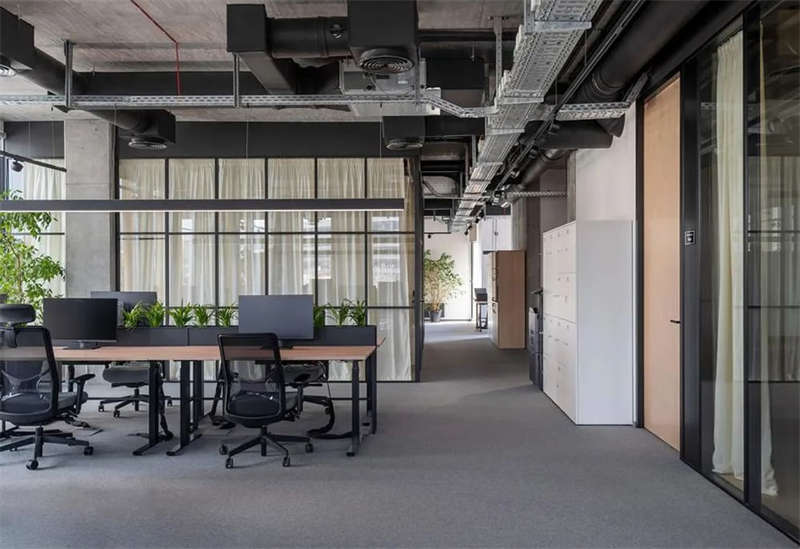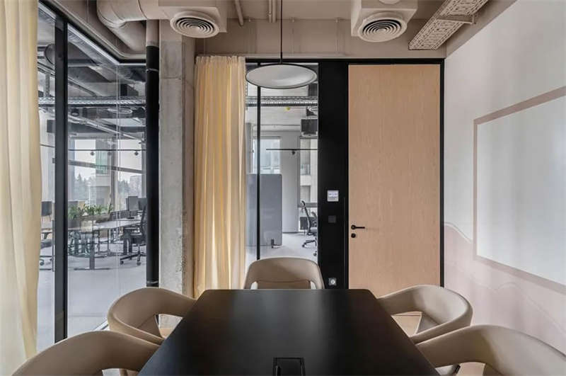 開放式空間因?yàn)榇┎辶舜罅康臅h室而被分隔成若干小型區(qū)域;而那些由此形成的開放協(xié)作區(qū)則被賦以清新的色彩,強(qiáng)調(diào)其功能特性的同時(shí)也營造出一個(gè)活力多彩的空間表情,與此同時(shí),這些空間也與其它區(qū)域一樣保持同樣的工業(yè)觸感和一致的基調(diào)。