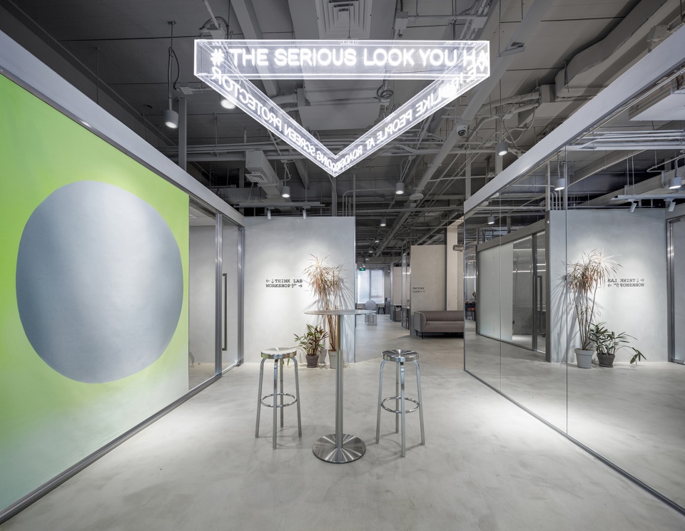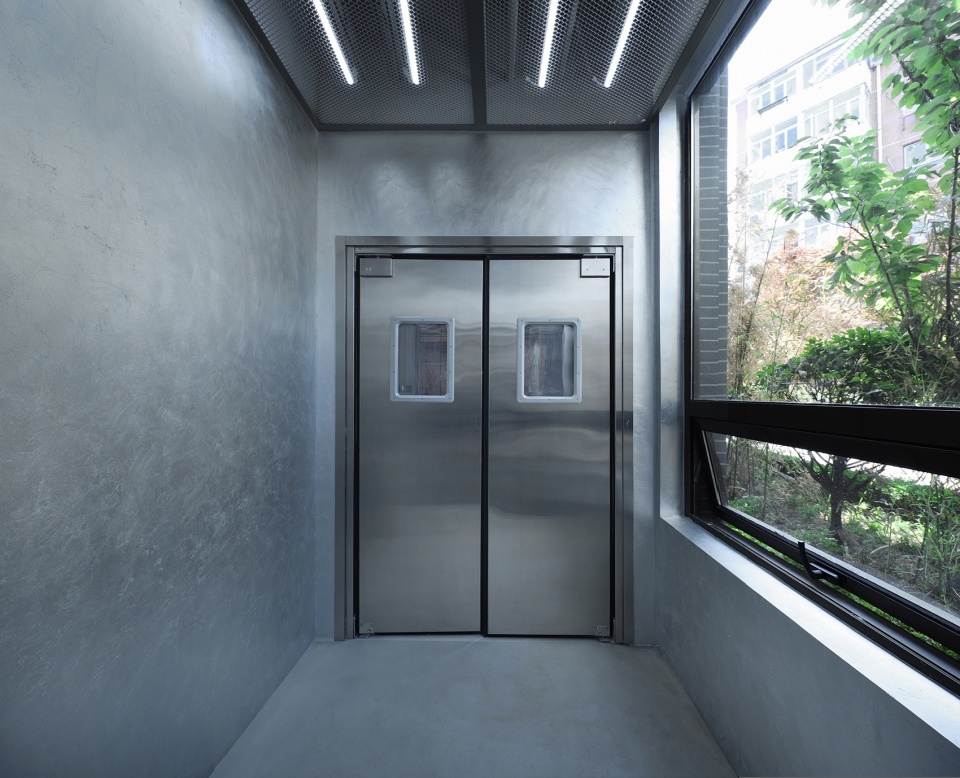 空間有兩個(gè)入口,主入口保證通行和展示,次入口則作為一個(gè)工廠的精神象征。設(shè)計(jì)師采用工廠車間金屬推拉門和防撞門作為工廠的大門,將粗獷銳利的工業(yè)感發(fā)揮到極致。前廳四壁貼有銀箔,作為對(duì)電影《Factory Girl》的致敬。