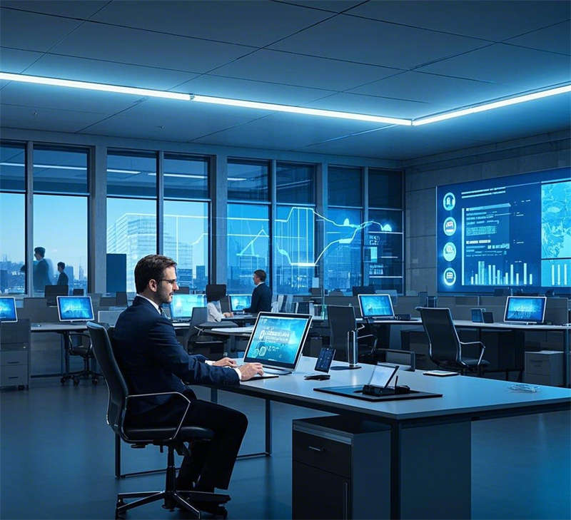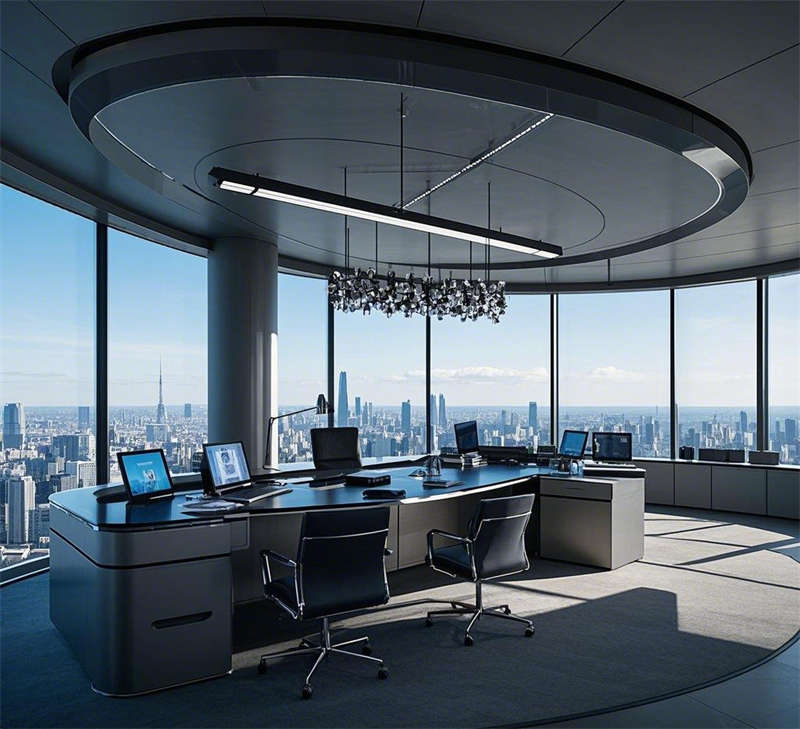 前臺(tái)接待室以懸浮式前臺(tái)和全息投影動(dòng)態(tài)logo為核心,金屬質(zhì)感墻面與燈光效果結(jié)合,營(yíng)造出未來(lái)之門的第一印象。敞開式辦公室通過數(shù)據(jù)流全息屏幕和智能辦公桌,打造高效協(xié)作的數(shù)字化辦公環(huán)境。經(jīng)理辦公室采用全景落地窗和智能辦公系統(tǒng),簡(jiǎn)約大氣,兼顧商務(wù)與舒適。總裁辦公室位于頂層,全景視野與奢華材質(zhì)相得益彰,藝術(shù)裝置彰顯領(lǐng)導(dǎo)風(fēng)范。