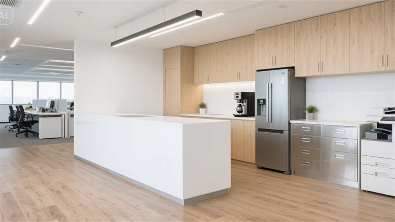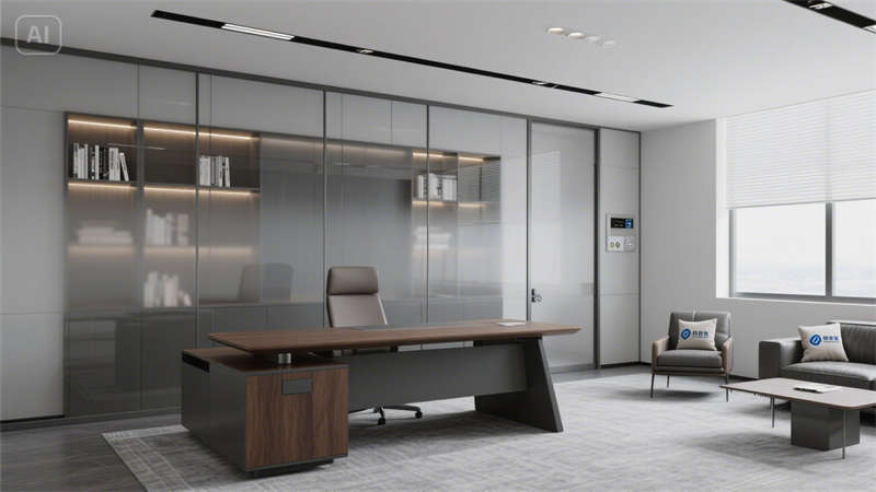 開放式辦公區(qū)以可升降桌、協(xié)作島與高吧臺休憩區(qū)構(gòu)建靈活場景,穿孔吸音天花與淺木紋PVC地板弱化工業(yè)冷感;獨立辦公室通過灰玻隔斷與胡桃木家具平衡隱私與通透感。公共支持區(qū)、標準會議室等空間,均以啞光金屬、淺灰肌理漆等統(tǒng)一材質(zhì)串聯(lián),配合3500K色溫燈光,形成連貫的視覺呼吸節(jié)奏。
