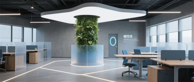 入口大廳以8米寬LED弧形屏呈現(xiàn)動(dòng)態(tài)視覺沖擊,懸浮曲面黑巖板前臺(tái)與天花垂墜的3D打印樹脂裝置形成虛實(shí)對(duì)話;開放式辦公區(qū)通過模塊化磁吸工位與中央綠植柱,實(shí)現(xiàn)靈活協(xié)作與生態(tài)療愈的平衡;總裁辦公室270°全景落地窗搭配懸浮會(huì)議島,幾何切割天花與火山石茶臺(tái)演繹力量與自然的共生哲學(xué)。