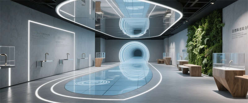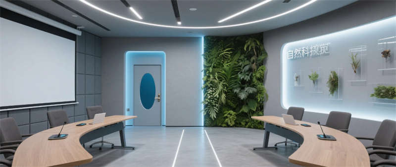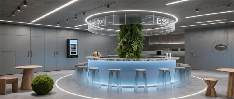 各區(qū)域通過四大統(tǒng)一性語言緊密串聯(lián):霧霾藍(lán)橢圓金屬門把手貫穿全空間,再生材料家具呼應(yīng)可持續(xù)發(fā)展理念,聲學(xué)墻面嵌入本地植物標(biāo)本強(qiáng)化生態(tài)屬性,智能燈光系統(tǒng)則通過4000K色溫線性燈帶實(shí)現(xiàn)晝夜場景的無縫切換。特別設(shè)計(jì)的全息投影展廳與智能階梯會(huì)議室,通過LED交互地屏與AR懸浮展臺(tái),將品牌科技基因融入空間體驗(yàn)。