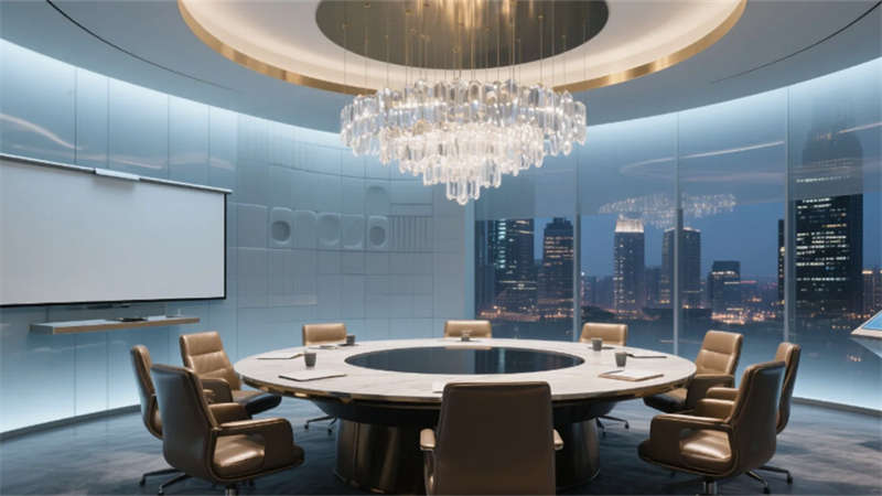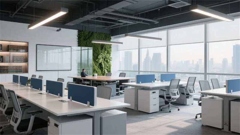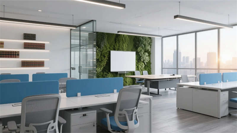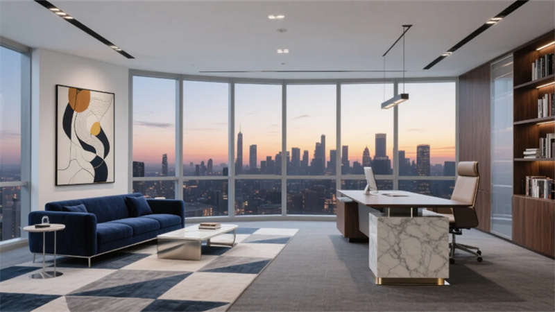入口處弧形接待臺(tái)似律法天平,發(fā)光企業(yè)標(biāo)識(shí)懸浮于透光大理石背景墻,線性燈光如正義之軌延伸至開放式辦公區(qū)。玻璃幕墻外合肥城市天際線成為動(dòng)態(tài)畫布,智能升降桌與模塊化工位詮釋高效協(xié)作。合伙人辦公室的270°環(huán)景視野,將巢湖煙波與都市繁華收于案頭,霧化玻璃在私密與開放間自由切換。
