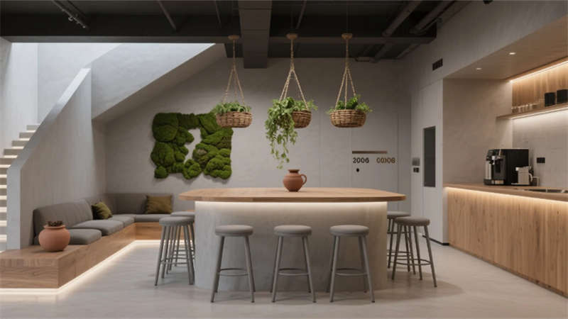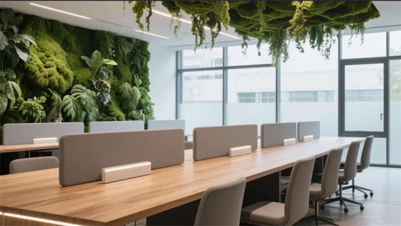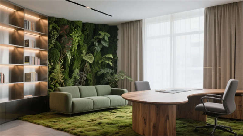 該設(shè)計(jì)以“自然共生”為脈絡(luò),將綠植生態(tài)系統(tǒng)與現(xiàn)代辦公需求深度融合。入口處以苔蘚藝術(shù)臺(tái)與流水光墻奠定基調(diào),流動(dòng)的綠意從呼吸幕墻延伸至開(kāi)放辦公區(qū),原木桌面在漫射天光中模糊室內(nèi)外界限。獨(dú)立辦公室的垂直森林墻與靜音艙的苔蘚隔斷,在私密空間延續(xù)生態(tài)語(yǔ)言。