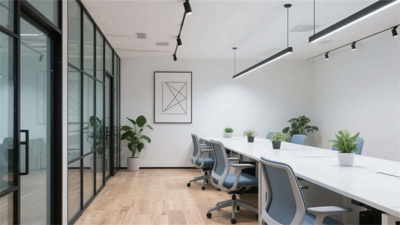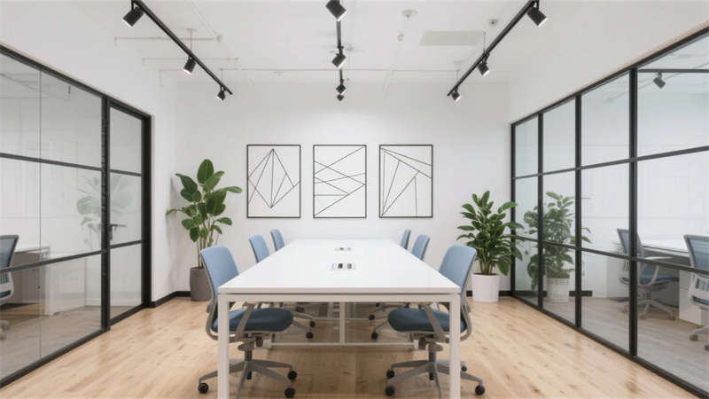 該辦公空間以現(xiàn)代簡約主義為基調(diào),摒棄冗余裝飾,通過材質本真與光影韻律構建理性而溫潤的場域。開放式布局打破傳統(tǒng)隔閡,淺木色地板與純白立面奠定寧靜氛圍,黑色金屬框架勾勒結構張力,形成流動的視覺節(jié)奏。