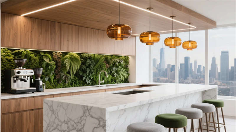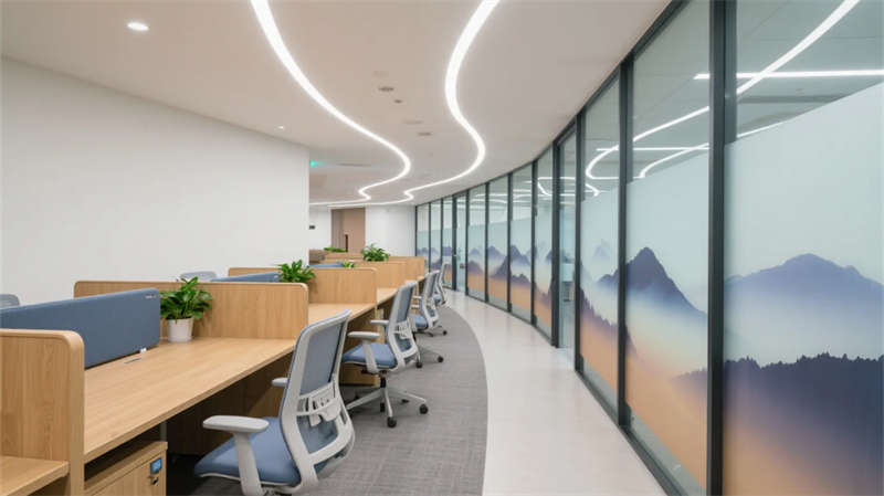 階梯式沙龍區(qū)打破傳統(tǒng)會議格局,弧形看臺激發(fā)平等交流,全息投影讓思維可視生長。茶水間垂直花園與咖啡香氣交織,成為非正式碰撞火花的土壤。獨立辦公區(qū)低隔斷設(shè)計延續(xù)視野通透,曲線燈帶如枝蔓延伸,提示著人與空間的有機(jī)聯(lián)結(jié)。