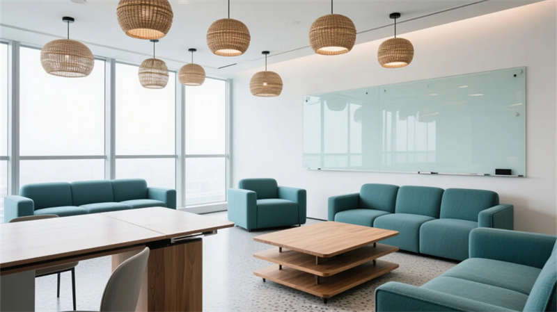 智能會議艙化身科技繭房,霧化玻璃平衡開放與隱私,觸控桌面簡化流程。貫穿始終的暖木、灰白與苔蘚綠,在全景天光下沉淀出寧靜能量。此處不僅是工作容器,更是蚌埠創(chuàng)新浪潮下,滋養(yǎng)靈感、尊重個體的未來生態(tài)聚落。