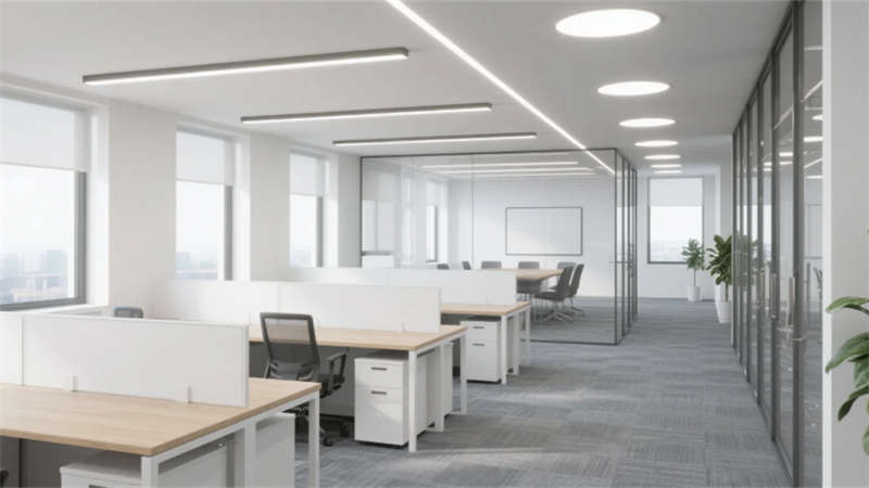 外立面采用橫向分割的玻璃幕墻與淺灰金屬框架,懸挑雨棚與隱藏式燈帶強(qiáng)化幾何美學(xué),夜晚呈現(xiàn)輕盈通透的視覺印象。大堂以白色石材與淺木前臺奠定簡約基調(diào),線性燈帶引導(dǎo)動線,綠植墻與玻璃隔斷休息區(qū)平衡商務(wù)與休閑氛圍。辦公區(qū)通過白色工位隔斷與淺木桌面實現(xiàn)高效布局,線性燈光與落地窗引入充沛自然光,玻璃會議室保障通透視野。
