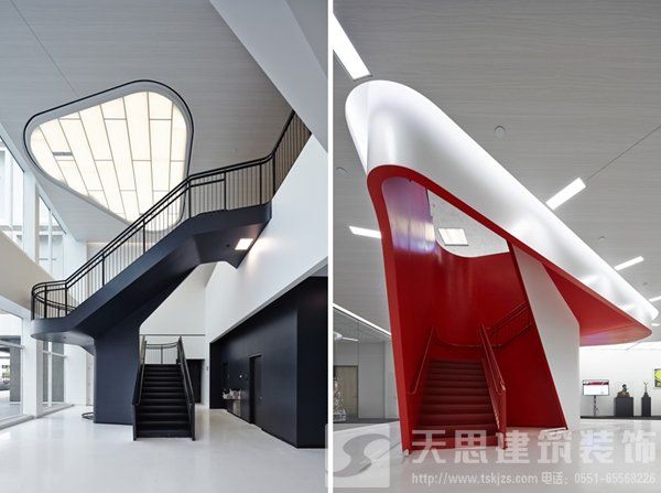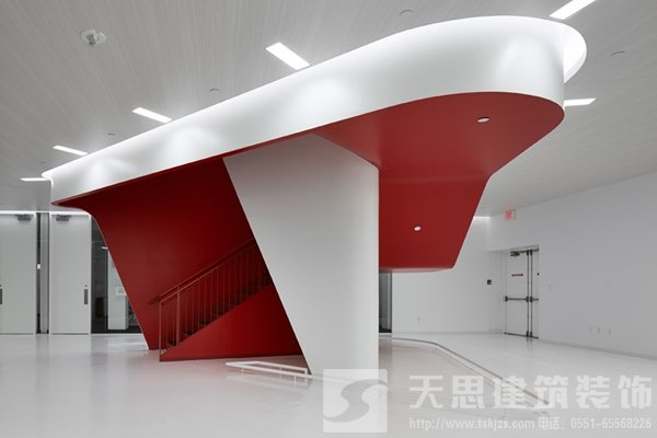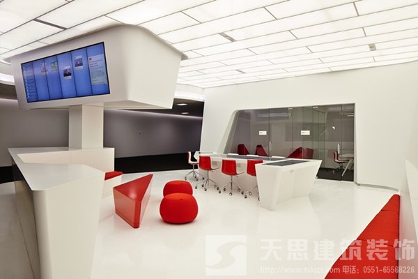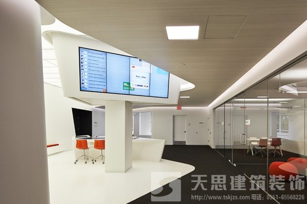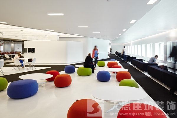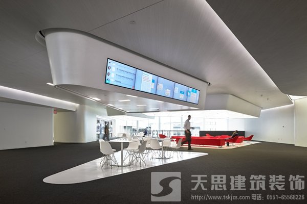 綜合大樓過渡區(qū)設(shè)計(jì)為開放式合作工作區(qū)域,傳統(tǒng)的理念通常認(rèn)為這里和工作場(chǎng)所相比不是那么有用,但是很多富有成效的非正式的討論往往在這里誕生。每個(gè)工作中心都配有色彩鮮明的家具,頂部下方挑檐底面突出的吊頂造型內(nèi)嵌LED顯示屏,不斷滾動(dòng)播出最新信息,包括各種通知、員工和訪客新聞、各種公告、新聞事件以及全球3M公司員工信息。