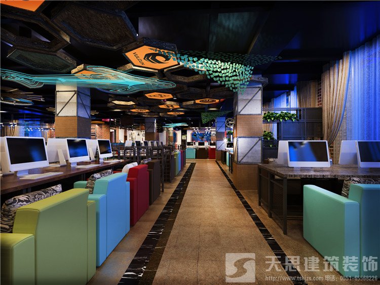 燈光要配合整個網(wǎng)吧的氛圍來裝飾。分為主照明光、裝飾燈光、廣告燈箱幾部分。主照明光不宜過亮,掩蓋其他裝飾燈光的效果。在燈光方面可以多借鑒一些成功網(wǎng)吧的案例,或讓裝修設(shè)計公司來進(jìn)行設(shè)計。其目的也是主要突出本網(wǎng)吧特色。燈光一般分為主光源,輔助光源,輔助光源包括各種燈帶,效果燈,以及射燈,以及燈箱的設(shè)計。墻體在裝飾方面可以做大型的噴畫和本網(wǎng)吧LOGO或游戲廠商的廣告?;驀娡砍删W(wǎng)吧的裝飾格調(diào)色。盡量的保持統(tǒng)一的顏色。來體現(xiàn)網(wǎng)吧的大氣。