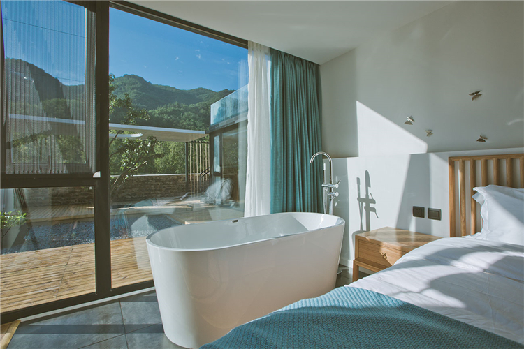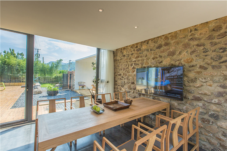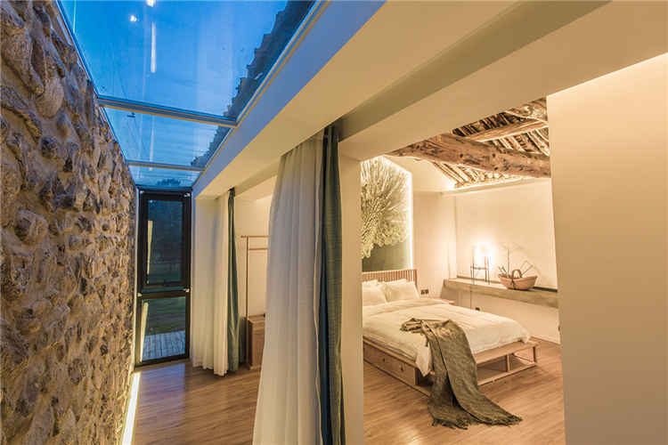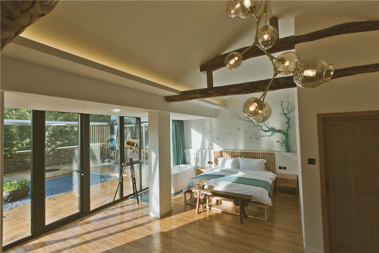 “隨著越來越快的生活節(jié)奏我們每天奔忙,每天遺忘城市越來越近,鄉(xiāng)村卻越來越遠”。這所名為“畫框里”的民宿位于水泉子村,而名字寓意為將百里畫廊的山水美景留在畫中院中。可看到名副其實靈動的山水畫這四季的變幻,凝集了我們對生活所有的向往。落地窗邊放置了浴缸做一個泡泡浴一眼望去是院落的美景和遠山的意境。主臥空間很寬敞,新中式的原木配灰色的簡易家具些許的現(xiàn)代元素金屬攝影燈使房間內(nèi)多一份輕松感。