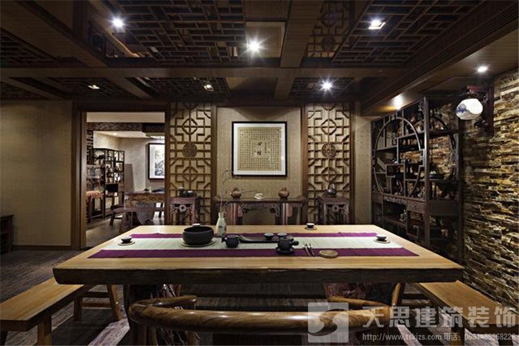 古典中式裝修茶樓會所空間裝飾有極強的設(shè)計感,高低錯落的掛畫與格柵窗落增加茶室的藝術(shù)美,原色原味的樹根茶幾集實用與欣賞一體,泡一杯清茶,就進入了一片碧綠的天空,這里將成為愛茶人士的最愛。