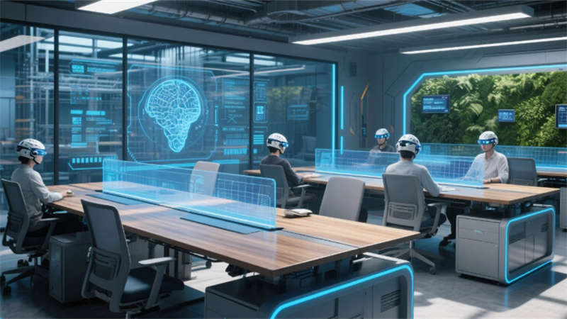 生態(tài)基因貫穿每個(gè)細(xì)節(jié):光伏連廊的遮陽發(fā)電結(jié)構(gòu)隨日照角度變幻肌理,雨水回收裝置化作中庭的液態(tài)雕塑,木紋鋁材桌面流淌著實(shí)時(shí)產(chǎn)能數(shù)據(jù)。智慧會(huì)議室的聲學(xué)穹頂折射出數(shù)據(jù)暴雨,玻璃幕墻在沙漠與極地場景間瞬時(shí)切換,腕表投影界面與全息沙盤構(gòu)成決策中樞。