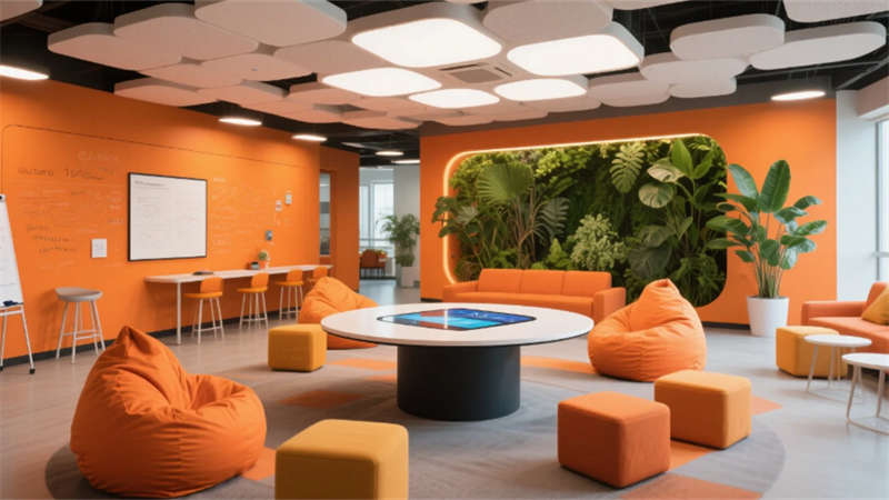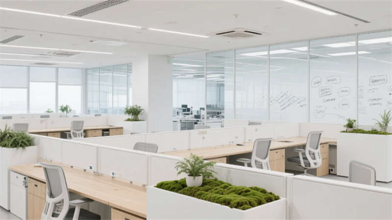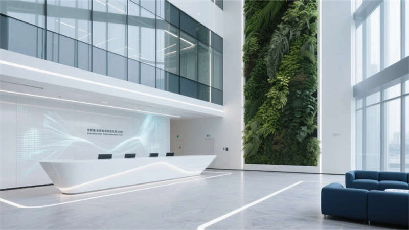步入其中,純凈的白色與淺灰基調構筑出開闊明亮的基底,大面積玻璃幕墻邀請陽光自由流淌。室內,垂直綠墻與蔥郁盆栽如音符般跳躍,為嚴謹?shù)难邪l(fā)環(huán)境注入蓬勃生機。開放辦公區(qū)強調協(xié)作與靈活,可書寫的玻璃墻面激發(fā)無限創(chuàng)意;高度自動化的核心生產車間則如同精密的樂章,潔凈無塵的環(huán)境、流線型的自動化設備與身著無塵服的工程師,共同演繹著尖端制造的嚴謹與高效。從充滿科技藝術感的展示廳、活力四射的創(chuàng)意協(xié)作區(qū),到靜謐專注的工作艙、溫馨舒適的休憩社交中心,再到專業(yè)大氣的會議空間,每一處功能區(qū)域都浸潤著統(tǒng)一的未來主義美學——簡約的線條、智能的光影、環(huán)保的材質與克制的企業(yè)色點綴。
