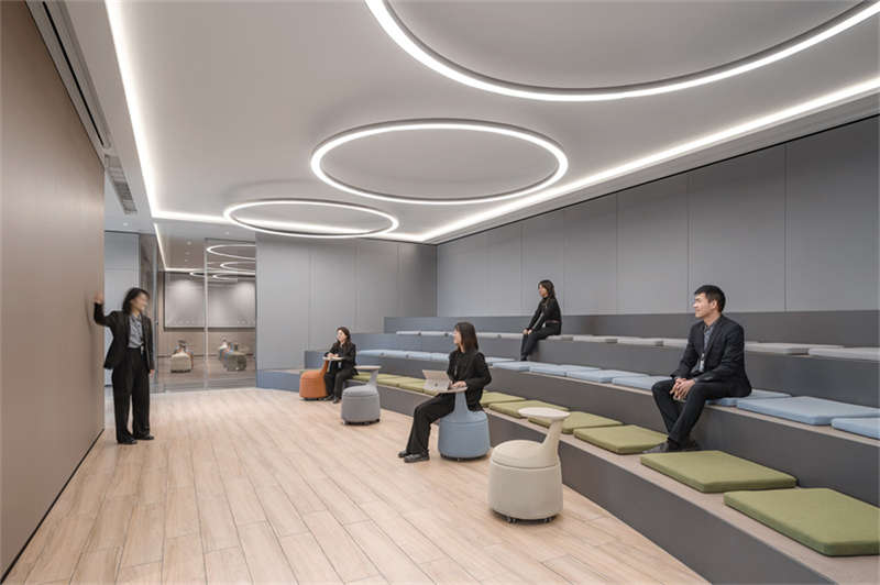 以高效私密和開放交流為光譜的兩軸,設(shè)計團(tuán)隊設(shè)計了完全私密的電話亭,部分私密的玻璃盒子辦公區(qū),半開放的格柵盒子辦公區(qū),以及完全打開鼓勵交流的開放式辦公區(qū)。不同尺度,不同開放度的辦公區(qū),為所有員工提供了包容、公平、有彈性、可持續(xù)和健康的工作空間,社恐與社牛,各得其所。