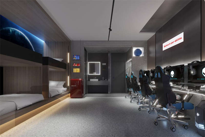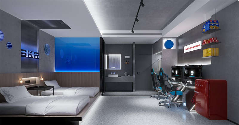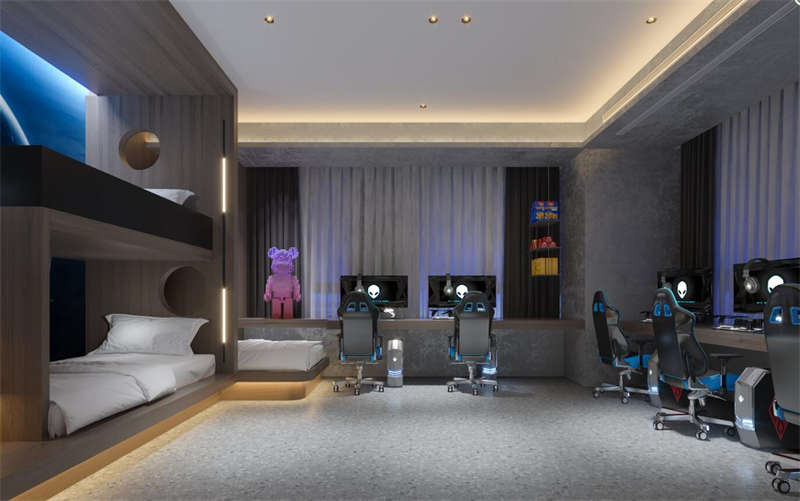 電競(jìng)酒店不同于網(wǎng)吧的一點(diǎn)就是環(huán)境舒適,安靜不嘈雜,體感更舒適,由于空間隱蔽,隱私性和自由度更高一些,這些的要求需要在室內(nèi)設(shè)計(jì)的環(huán)節(jié)中有所呈現(xiàn)。