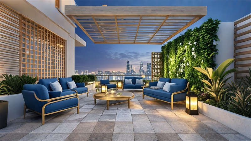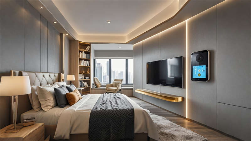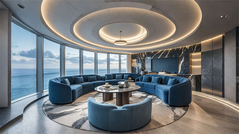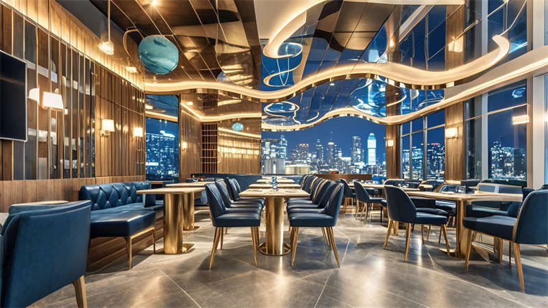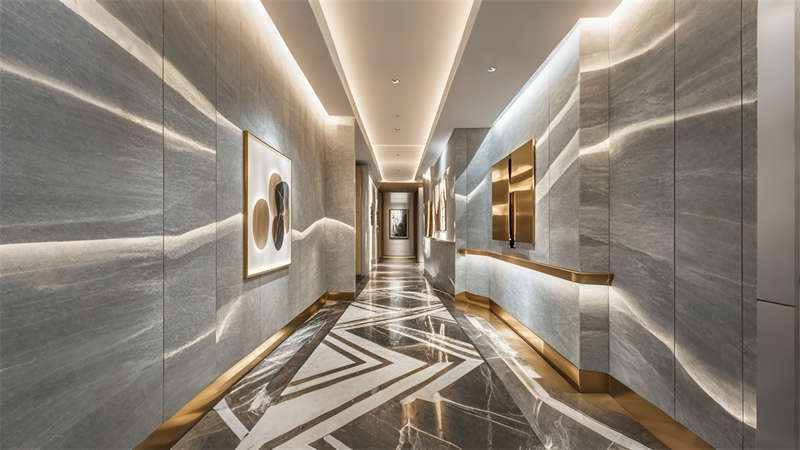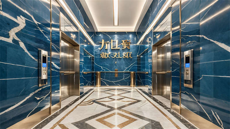 色彩體系以香檳金與深海藍(lán)為主調(diào),大堂采用香檳金金屬線條勾勒建筑肌理,搭配深海藍(lán)大理石營造視覺重心??头繀^(qū)運用暖灰硬包墻面平衡色彩強度,通過2700K暖光與4000K中性光分區(qū)照明塑造晝夜場景。材質(zhì)組合注重層次:大理石地面、金屬構(gòu)件、絨布軟包形成質(zhì)感三部曲。