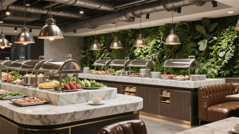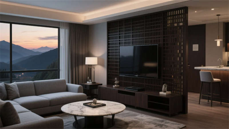 餐廳以工業(yè)風(fēng)吊燈與綠植墻碰撞出活力氛圍,開放式取餐臺與大理石餐桌彰顯品質(zhì);行政套房客廳通過L型布藝沙發(fā)、木格柵電視墻與山景落地窗,打造出私享化的社交場景。