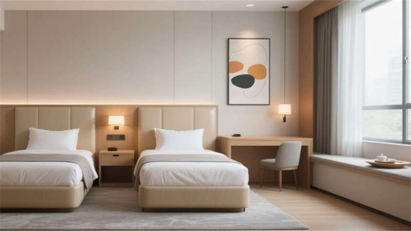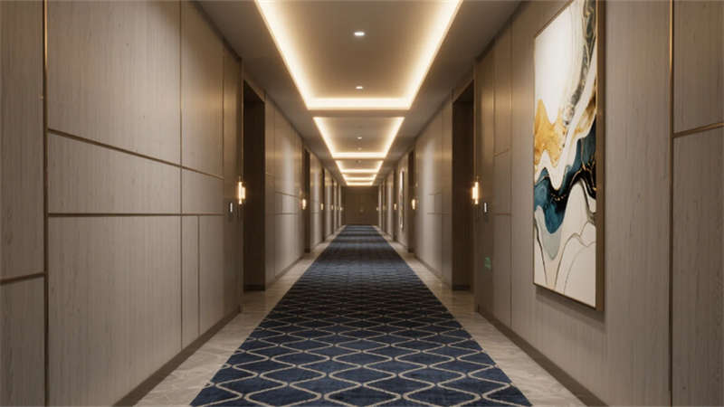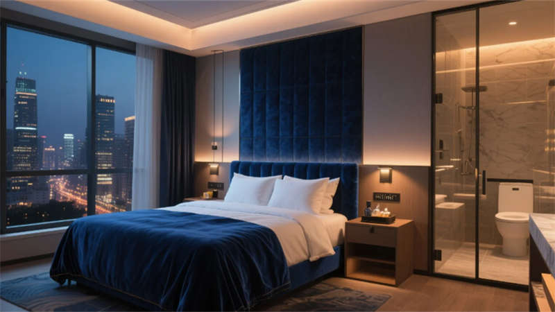 客房設(shè)計聚焦人性化體驗(yàn):大床房以深藍(lán)色絲絨床頭與城市夜景形成戲劇性對比,透明玻璃隔斷的圓形浴缸賦予空間通透感;雙床房通過原木色書桌、飄窗茶臺與抽象掛畫,平衡商務(wù)與居家需求。走廊則運(yùn)用深藍(lán)色幾何地毯與隱藏式燈帶,引導(dǎo)視線至盡頭的藝術(shù)畫作,靜謐中暗藏張力。