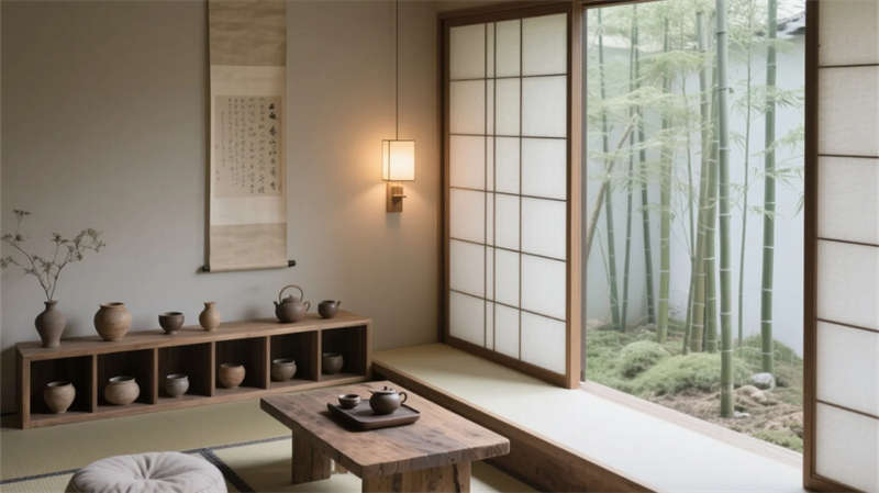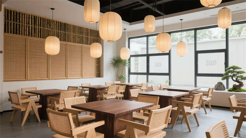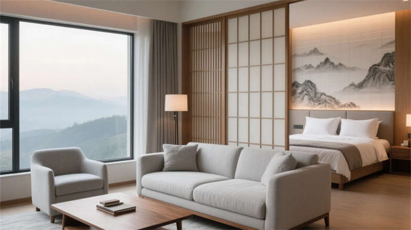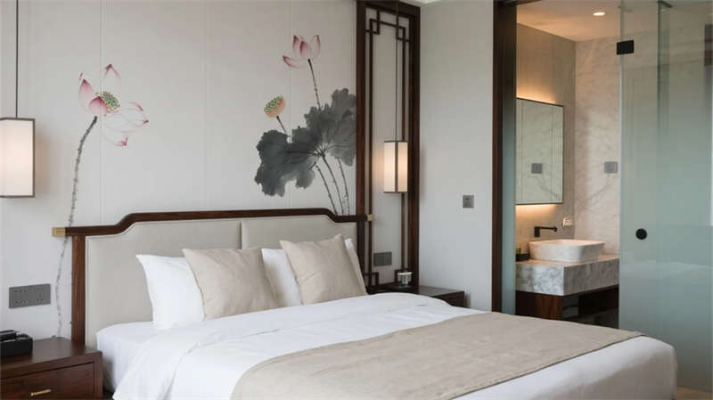 大堂以格柵天花與山水背景墻定調(diào),光影交錯(cuò)間傳遞寧靜力量。餐廳借竹編與紙燈演繹傳統(tǒng)匠心,窗外庭院景觀延伸視覺層次。客房摒棄繁復(fù)裝飾,棉麻材質(zhì)與低飽和度色彩引導(dǎo)深度放松,套房通過屏風(fēng)巧妙劃分動(dòng)靜區(qū)域。茶室以博古架和宣紙屏風(fēng)構(gòu)筑禪修意境,而庭院花園的枯山水與竹影,則成為自然與建筑的共生隱喻。