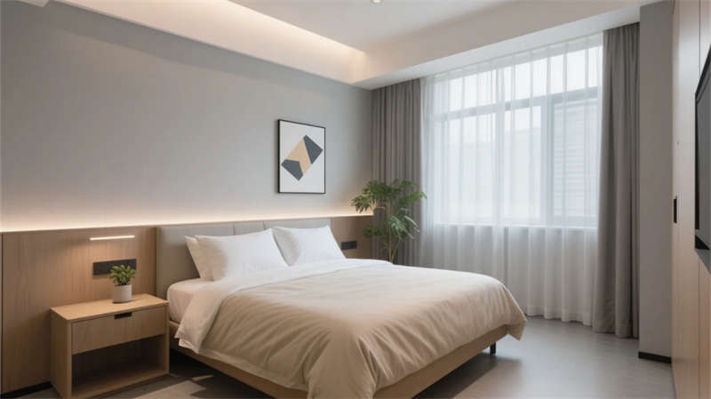 酒店以現(xiàn)代簡(jiǎn)約美學(xué)貫穿始終,走廊作為串聯(lián)各區(qū)域的紐帶,延續(xù)了整體的設(shè)計(jì)語(yǔ)言。弧形壁龕與懸浮天花板的線性燈光,柔和地引導(dǎo)動(dòng)線,淺木飾面與石材的碰撞在低調(diào)中彰顯質(zhì)感。壁龕內(nèi)的藝術(shù)擺件與垂墜綠植,將自然氣息融入過(guò)渡空間,打破傳統(tǒng)走廊的單調(diào)感。