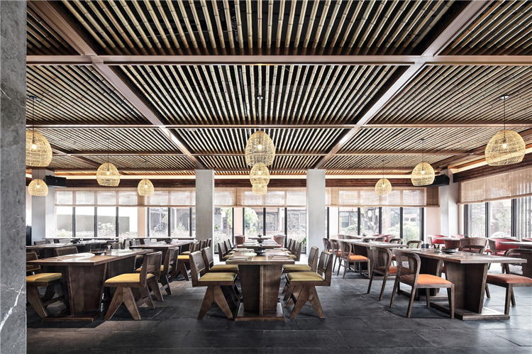 九華當(dāng)?shù)囟嘀衲?,設(shè)計(jì)就地取材,空間中運(yùn)用較多原木家具和竹制吊燈,及一些土陶制品,表達(dá)對本土文化的致敬和延續(xù),凈土在禪,于自然質(zhì)樸之中,斂去了浮華氣息。