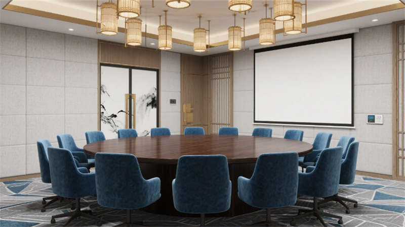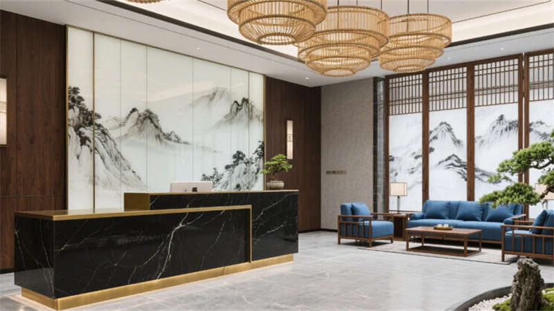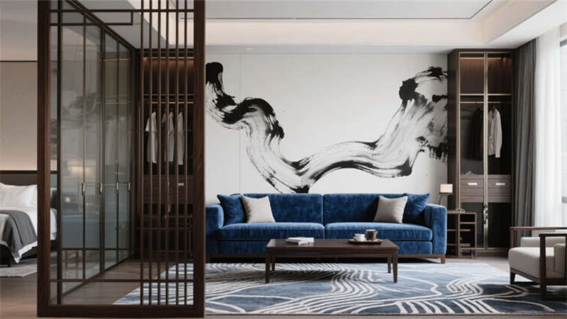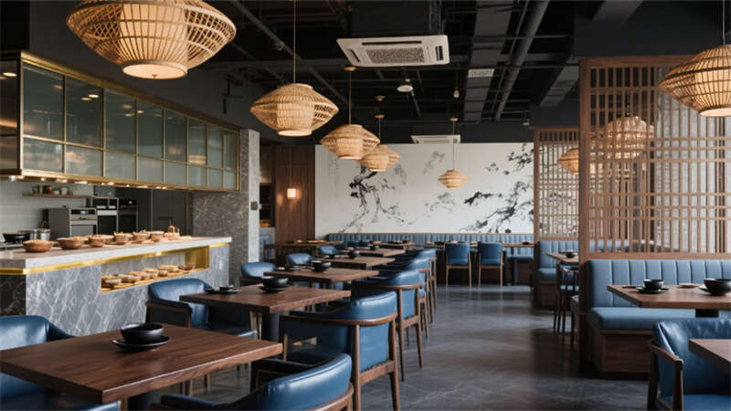 步入大堂,深胡桃木墻面與淺灰石材地面構(gòu)成經(jīng)典東方底色,水墨藝術(shù)玻璃屏風(fēng)似山巒疊嶂,懸浮竹編吊燈以編織肌理軟化空間。靛藍(lán)色沙發(fā)與黃銅細(xì)節(jié)的點(diǎn)綴,既延續(xù)外立面色彩邏輯,又激活視覺層次。餐飲空間延續(xù)木格柵語言,竹編燈罩與黑陶器皿在開放式廚房的金屬框架中碰撞,演繹“新舊共生”的餐飲儀式。