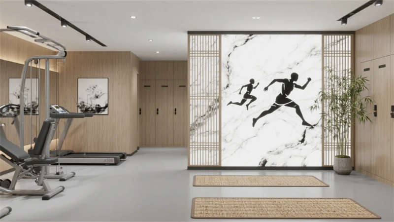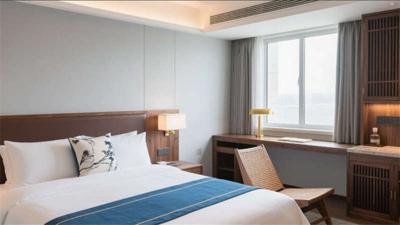 客房區(qū)域以“去符號(hào)化”手法詮釋東方美學(xué):深木紋床頭背板嵌入隱晦的水墨紋樣,藤編躺椅與迷你吧木格柵柜體,在3000K暖光中營造居停的松弛感。套房通過絲絨沙發(fā)與抽象水墨畫提升奢華調(diào)性,浴缸區(qū)的竹藝卷簾巧妙平衡通透與私密。公共空間亦貫徹統(tǒng)一語匯——健身房竹編地墊與水墨運(yùn)動(dòng)壁畫、走廊絹絲燈箱與枯山水景墻,皆以現(xiàn)代材質(zhì)轉(zhuǎn)譯傳統(tǒng)元素。