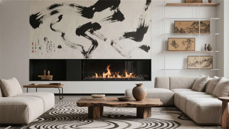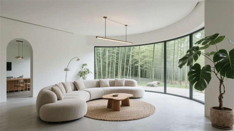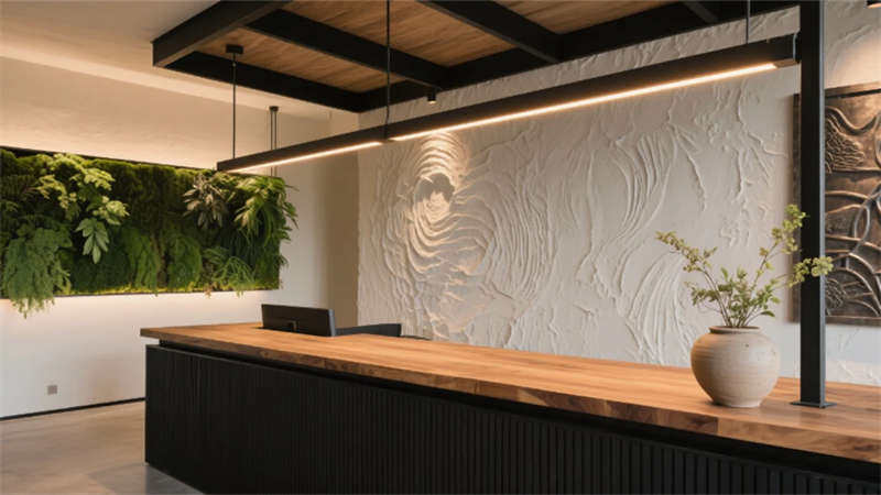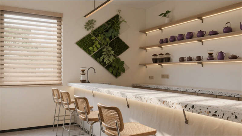 步入大廳,弧形亞麻沙發(fā)與編織地毯圍合出松弛場(chǎng)域,整面落地窗借景庭院竹影,琴葉榕與懸浮綠植墻形成立體生態(tài)敘事。多功能區(qū)以巢湖水波紋地毯呼應(yīng)地域脈絡(luò),壁爐旁的非遺火筆畫(huà)裝置暗藏城市文化密碼??Х劝商倬幾闻c水磨石臺(tái)面碰撞,幾何綠植墻在百葉光影中演繹晨昏詩(shī)意。
