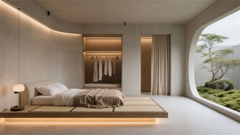 衛(wèi)浴空間化身立體水景容器,鏡面天花反射青石浴缸與垂吊綠植,形成虛實(shí)交織的自然劇場(chǎng)。所有構(gòu)件皆服務(wù)于居者與環(huán)境的對(duì)話,混凝土墻體在晨昏光線中呈現(xiàn)不同肌理,定制家具的圓弧收邊柔化現(xiàn)代主義的冷冽。