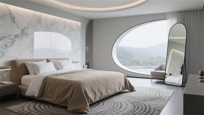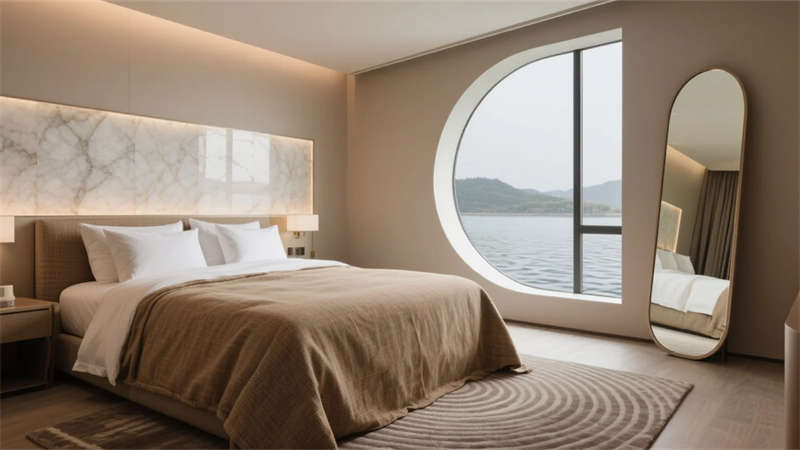 每一處細(xì)節(jié)皆成藝術(shù)現(xiàn)場(chǎng)——走廊夯土墻鐫刻時(shí)光肌理,發(fā)光地磚指引探索路徑;臥室弧形鏡面折射虛實(shí),讓人沉入湖居夢(mèng)境。這里不僅是棲居之所,更是一場(chǎng)喚醒感官的在地美學(xué)巡禮,讓合肥的湖韻林語(yǔ),成為流淌于日常的奢享印記。