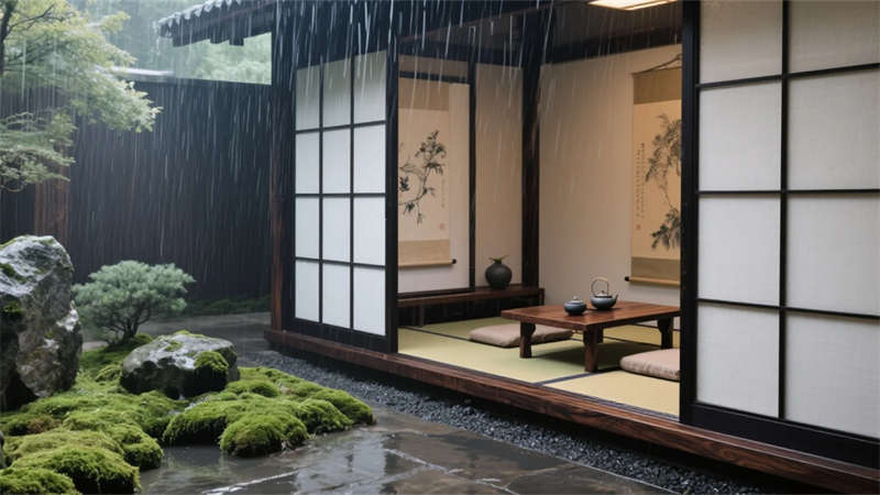 設(shè)計(jì)深諳留白哲學(xué),麻質(zhì)織物、陶藝器皿與胡桃木家具,以觸覺溫度軟化冷冽材質(zhì)。浴室如天然巖洞,玉石板透光似月暈;書閣古籍與當(dāng)代陶器并置,時(shí)空在翻頁(yè)間交融。庭院借景造境,雨簾青苔應(yīng)和自然呼吸,無(wú)邊水池倒映天光云影,火爐星夜下燃起歸巢暖意。