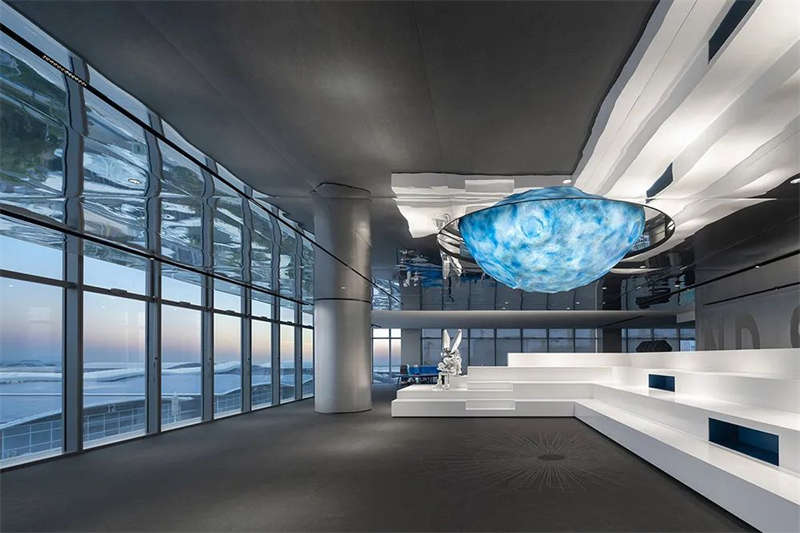白色臺階半圍合而成的區(qū)域,擁有絕佳的風景,設(shè)計充分挖掘功能的實用性,帶有視覺沖擊力的隕石吊燈和Robbie兔,讓這里具備了舞臺的屬性,成為具有強交互感的沙龍區(qū)。