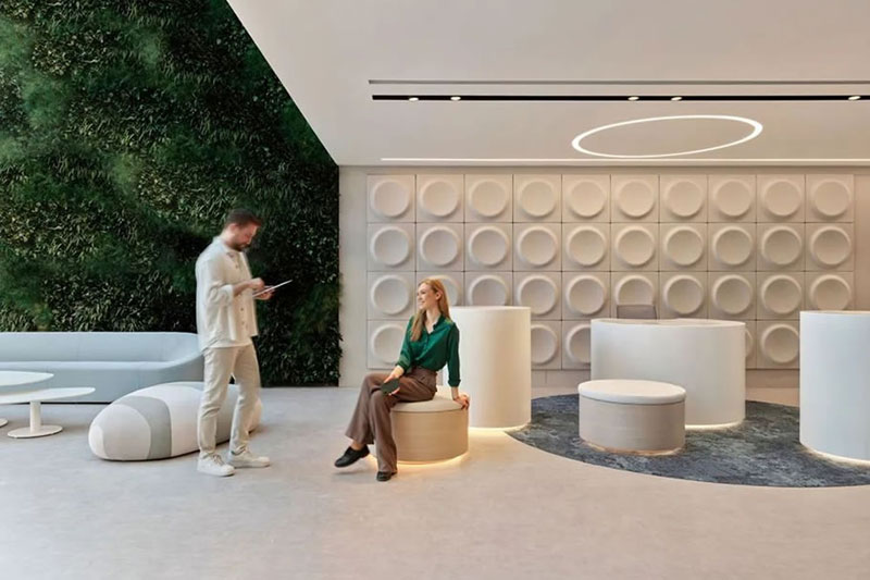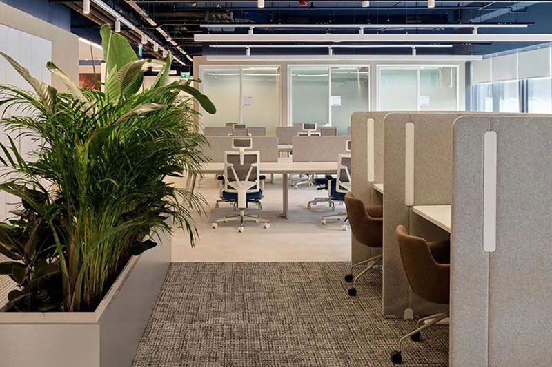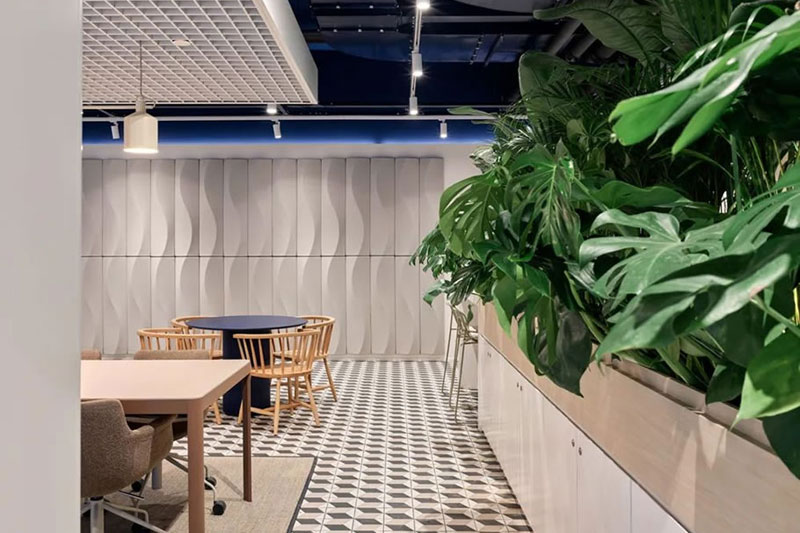 開放協(xié)作、動靜相容、靈活多元(寧靜的工作區(qū)、舒適的休閑區(qū)、開敞多元的社交區(qū)和協(xié)作區(qū)),建立在ABW基礎(chǔ)上的超強(qiáng)適應(yīng)性空間規(guī)劃支持人們多樣化的工作需求。簡約溫馨的配色,加以韻律感的元素重復(fù)應(yīng)用,以及隨處可見的大量綠色植物,讓整個(gè)空間在恬靜溫婉中又洋溢著靈動的韻致。