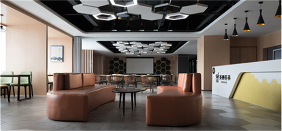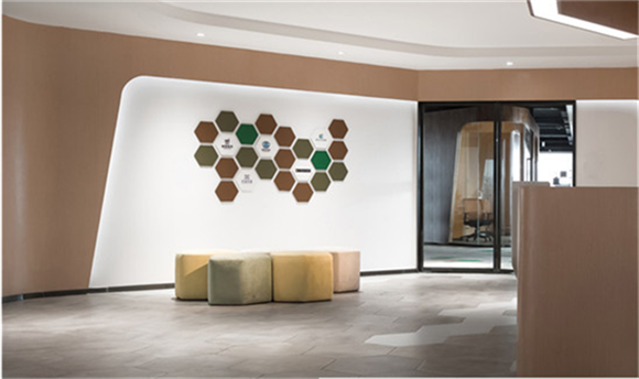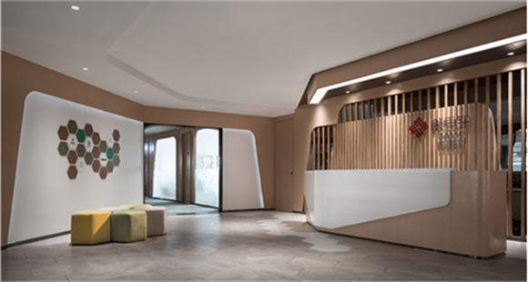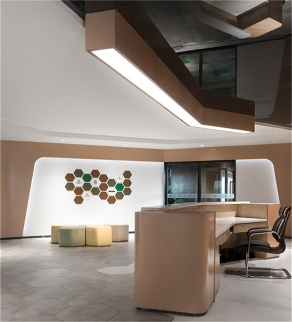 通過空間調(diào)度,模糊各個(gè)工作區(qū)域間的界限,打造既開放、又不乏私密性的辦公區(qū)。除此之外,曲線與直線在空間共存,線條的形式感使辦公室充滿現(xiàn)代化與創(chuàng)意十足,極大的在視覺上滿足了客戶的營銷訴求,構(gòu)建來人第一感性認(rèn)知。