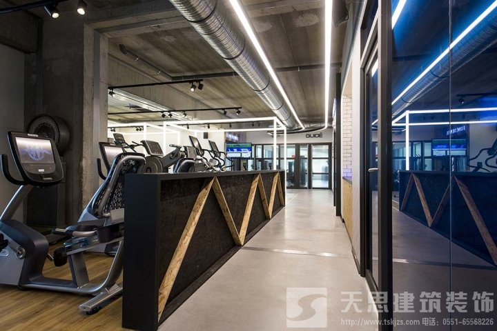 3、動感單車房設計 動感單車房的裝修和操房差不多,在風格設計中也要求注意與整個健身房的風格融合統(tǒng)一,不要只追求酷炫感。動感單車是一個特殊項目,具有極強的煽動性,可以即刻提升會員或參觀者的健身欲望,因此一般安排在整個健身房都能注意到的空間里。