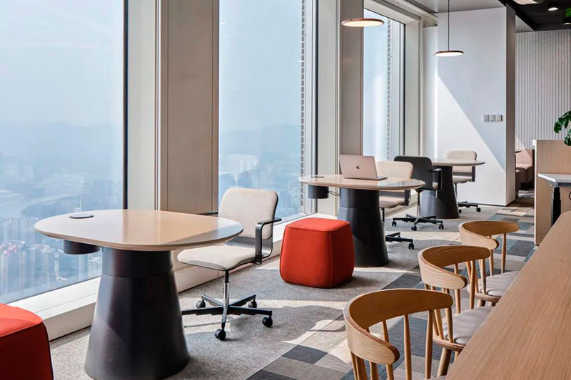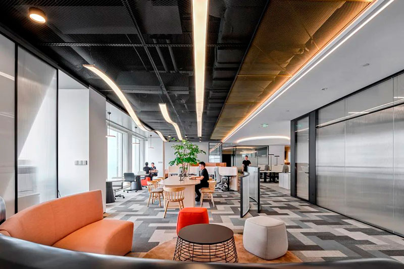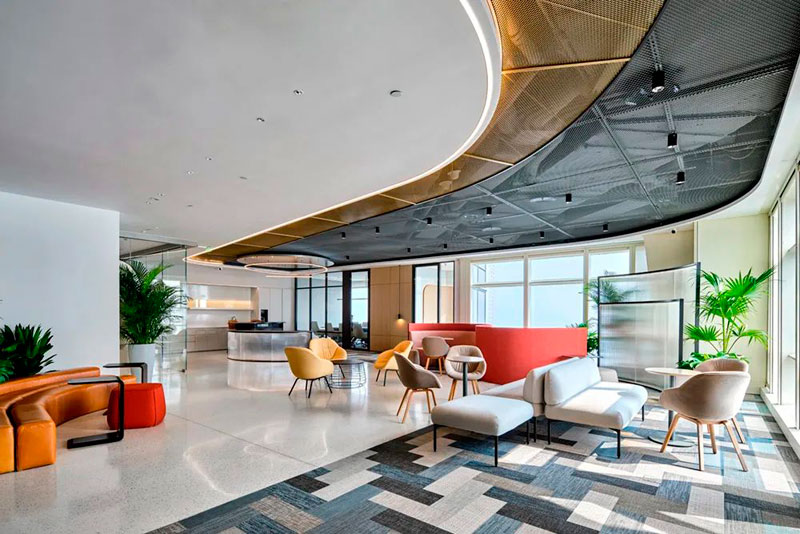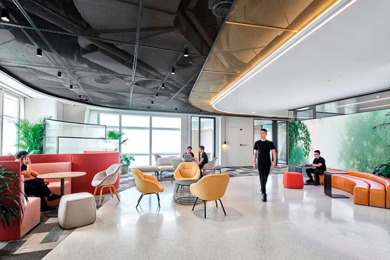 不同于投資公司的傳統(tǒng)形象,設(shè)計(jì)師以一個(gè)圓島吧臺(tái)和開(kāi)敞的自由交流區(qū)作為前廳接待場(chǎng)所。大量的自然光涌入室內(nèi),明凈開(kāi)闊。天花地面是圓轉(zhuǎn)流動(dòng)的曲線造型,采用水磨石地面、金屬網(wǎng)天花、Bolon塑膠地毯等各種新環(huán)保材料,輔以色彩鮮麗的多功能家具組合、大型LED屏和隨處點(diǎn)綴的綠植,呈現(xiàn)出年輕、現(xiàn)代、科技而又充滿能量的生命氣息。