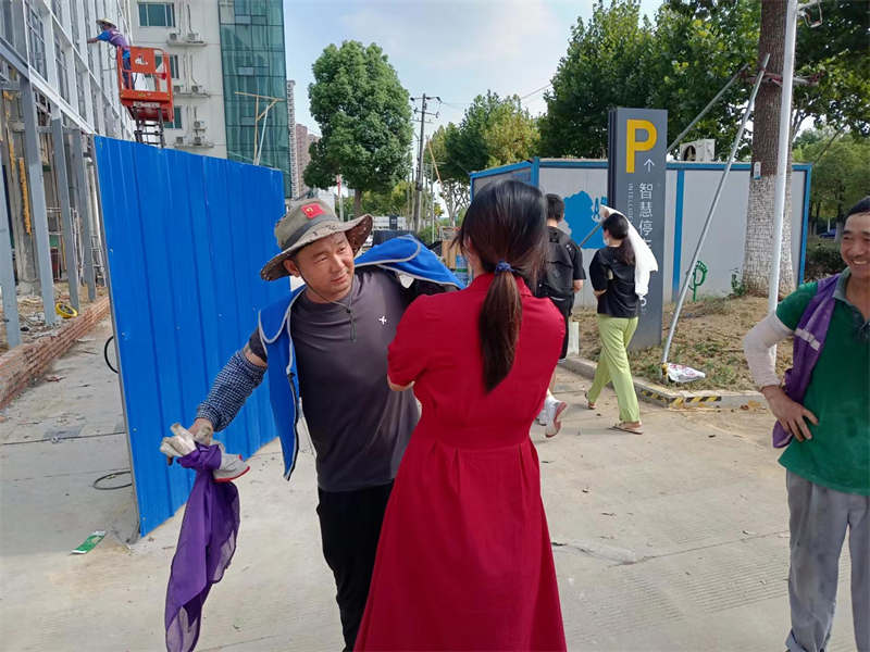 一到項目工地,就看見了一線工作者在40度酷暑的天氣下勞作,每一滴汗水都是辛苦工作的象征。胡主管將公司領(lǐng)導(dǎo)買的礦泉水,冰袋和安全作業(yè)馬甲都搬了下來,招呼一線工作者過來喝水休息一會。在慰問施工勞務(wù)作業(yè)人員時,她強(qiáng)調(diào),要多方舉措防暑降溫,保證高溫作業(yè)條件下員工的身體健康;要科學(xué)安排作息時間,避免疲勞施工,保證安全。