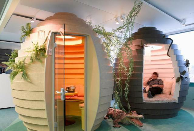說起最吸引人跳槽的辦公室設(shè)計,大家可能第一時間想到的就是谷歌公司的創(chuàng)意辦公室.辦公區(qū)域的每一處設(shè)計都別出心裁,融入了地方色彩,別具風(fēng)情.在這樣舒適愉悅的環(huán)境下辦公,谷歌總是能夠帶來許多令人眼前一亮的產(chǎn)品也有因可循了.谷歌辦公室以快樂健康,高效工作為目標(biāo).可以帶狗狗進入辦公室(貓星人暫時不行)的人性化規(guī)定,打造與大自然融合的熱帶雨林辦公區(qū)域,提供挑選自己喜歡的廚師做飯的個性化餐廳服務(wù).谷歌的確稱得上"要創(chuàng)造世界上最令人感到幸福、最能激發(fā)生產(chǎn)力的工作場所."的辦公室.