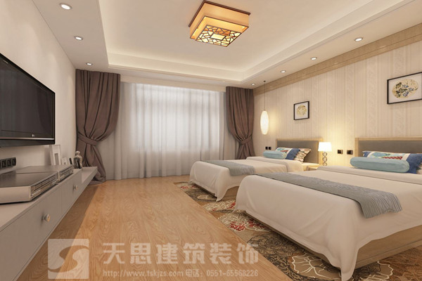 小型酒店客房,多以標(biāo)準(zhǔn)間、單人間為主,面積一般不會太大,不過可以利用延伸視覺效果的方法,來提升客房空間感。比如運用由淺到深、富有層次感的彩色壁紙,搭配淡雅干凈的鋪蓋,安裝采光自然、光照充足的落地窗,延伸空間的同時也提高了舒適度。