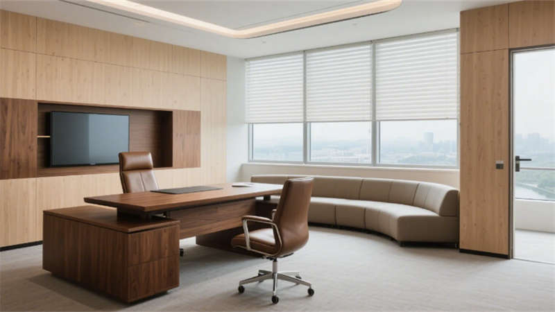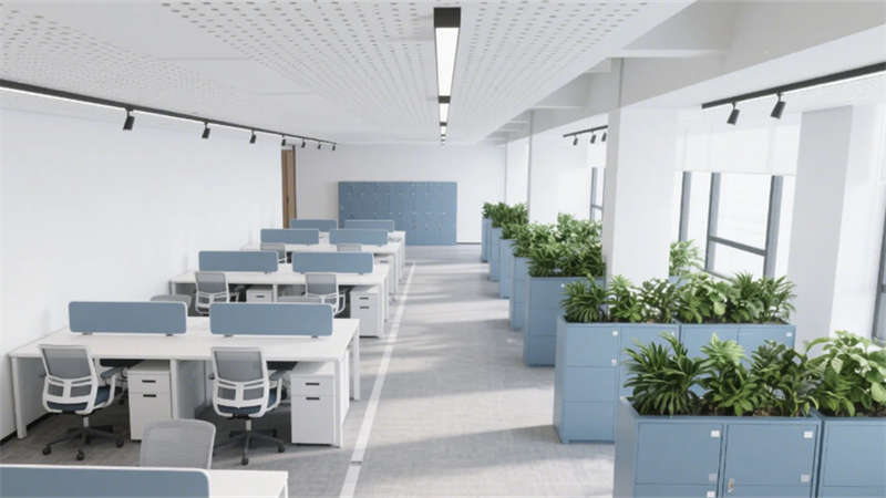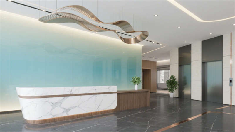 室內(nèi)空間強(qiáng)調(diào)功能與美學(xué)的平衡:入口大堂通過(guò)12米挑高藝術(shù)玻璃墻與企業(yè)色燈光系統(tǒng),構(gòu)建極具辨識(shí)度的第一視覺(jué);開(kāi)放式辦公區(qū)以模塊化工位、綠植隔斷及通透采光優(yōu)化協(xié)作效率;高管辦公室與會(huì)議空間則運(yùn)用木飾面、吸音材質(zhì)及智能設(shè)備,兼顧私密性與科技感。全案貫穿暖灰主色調(diào),局部以藍(lán)、橙跳色激活空間活力,啞光金屬、線(xiàn)性燈光與天然材質(zhì)碰撞,營(yíng)造理性而不失溫度的氛圍。