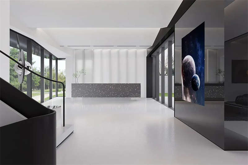 一層前臺(tái),以黑白創(chuàng)作出一個(gè)極致簡(jiǎn)潔的空間,兩側(cè)落地開窗實(shí)現(xiàn)無限延伸,空間的邊界更加柔軟,內(nèi)庭院成為接待區(qū)的裝飾景觀,前臺(tái)及背景以“帆”這一意象表達(dá)對(duì)于宇宙世界探索的起航。樹脂地坪的無接縫特性解決了材質(zhì)拼接的繁瑣,讓空間更加純粹簡(jiǎn)潔。