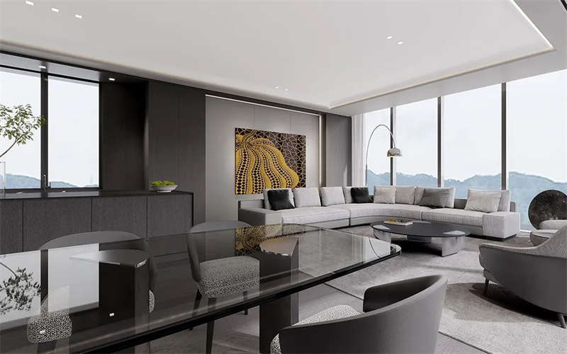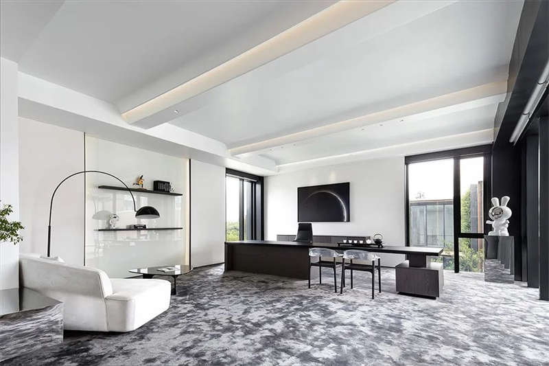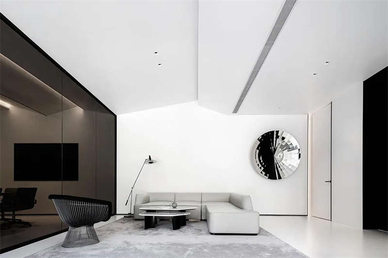接待區(qū)以沙發(fā)組和會(huì)議室實(shí)現(xiàn)休息、接待、和會(huì)議功能。沙發(fā)地毯圍合成舒適的功能區(qū),落地?zé)?、藝術(shù)裝置讓這里更有會(huì)客廳的親切感,灰色與白色的搭配經(jīng)典時(shí)尚。