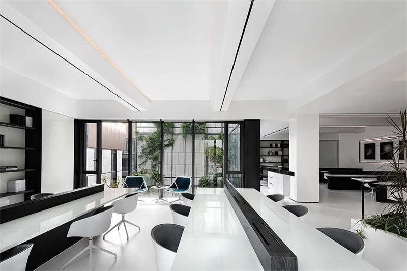 通過落地窗將庭院造景納入室內(nèi),視覺得到延伸,移步異景。六層的空間分別為接待和辦公空間,頂層住宅公寓,及地下層的休閑空間和車庫入口。不同的樓層位置皆可見庭院鮮活的景觀,自然哲學(xué)滲透在日常忙碌的工作中,對(duì)于四季的感知拉近了人與真實(shí)環(huán)境的聯(lián)系。