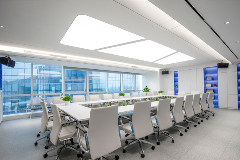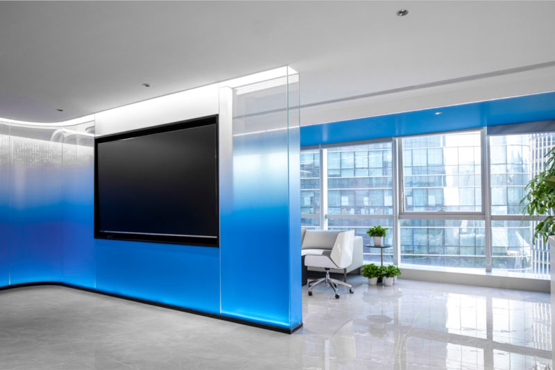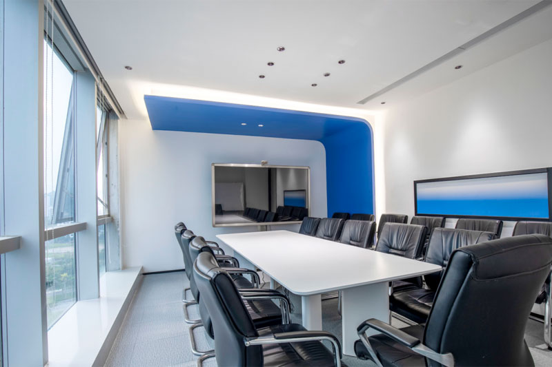 大小會(huì)議室都延續(xù)了空間的藍(lán)色基調(diào),利用通透的藍(lán)色玻璃分隔過(guò)道,使空間更加通透明亮,不僅讓視感增強(qiáng),也深刻的加強(qiáng)了品牌形象在訪客心中的作用。