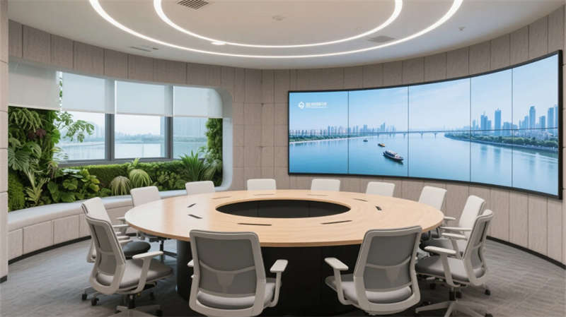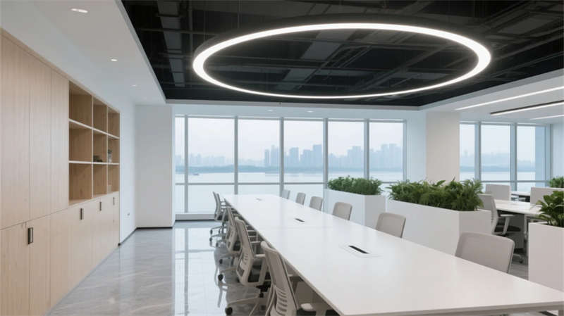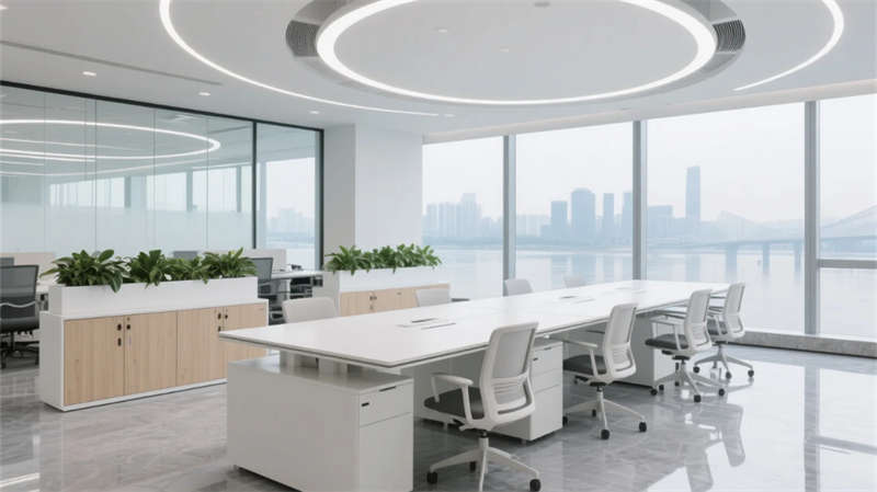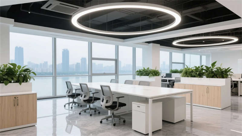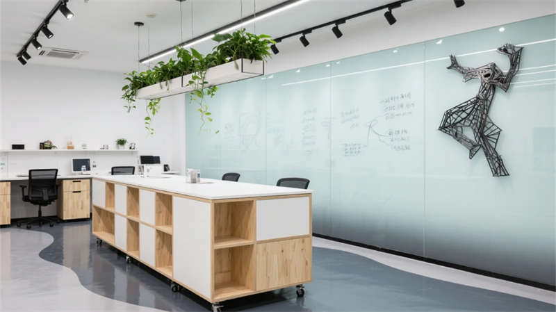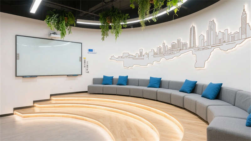 開(kāi)放辦公區(qū)以模塊化綠植隔斷柔化邊界,智能會(huì)議艙曲面屏動(dòng)態(tài)呈現(xiàn)江岸線,賦予協(xié)作以在地詩(shī)意。創(chuàng)意實(shí)驗(yàn)室的可書(shū)寫玻璃墻與磁吸家具激發(fā)即興創(chuàng)造,而階梯沙龍區(qū)弧形燈帶如江水蜿蜒,引導(dǎo)思想交匯。