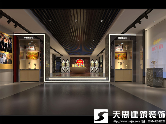 展廳是提高產(chǎn)品和企業(yè)品牌形象的場所,表達(dá)個性風(fēng)格是這個空間的關(guān)鍵。金龍魚通過利用地面折線分割跑道的表現(xiàn)與背景形象的鮮明顏色相互配合產(chǎn)生強烈視覺沖擊效果,令人耳目一新,印象深刻。在其中部設(shè)計中,運用厚重的體量感,如半圓形及魚形,將所有的空間有機地聯(lián)系起來,長久、富貴、不可侵犯。