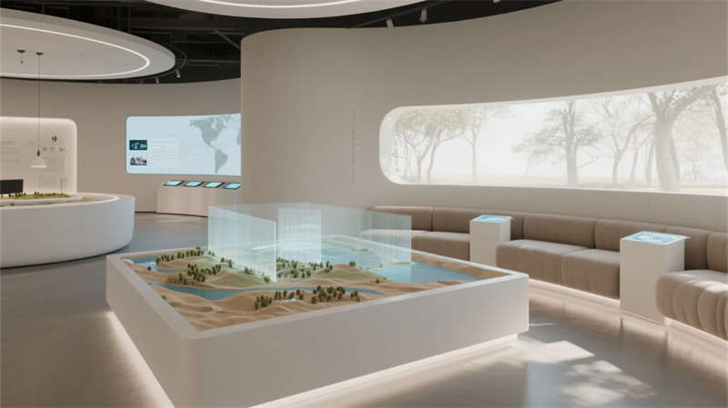 這座展廳以現(xiàn)代簡(jiǎn)約風(fēng)格為核心,打造流暢而富有張力的空間體驗(yàn)。入口區(qū)以開放姿態(tài)迎接參觀者,核心展示區(qū)陳列創(chuàng)新展品,互動(dòng)區(qū)通過科技裝置激發(fā)探索樂趣。多媒體區(qū)以視聽盛宴強(qiáng)化敘事,休息區(qū)則提供舒適角落促進(jìn)交流,會(huì)議區(qū)靈活多變適應(yīng)多樣需求。主題區(qū)巧妙融入本土特色,未來區(qū)以先鋒設(shè)計(jì)點(diǎn)燃靈感火花。整體設(shè)計(jì)中,簡(jiǎn)潔線條與中性色調(diào)營(yíng)造寧靜基調(diào),高科技元素如數(shù)字屏和智能照明無縫融入,增強(qiáng)功能性與藝術(shù)感??臻g動(dòng)線自然引導(dǎo),從喧囂到沉思,材質(zhì)選用環(huán)保而溫暖,綠植點(diǎn)綴平衡科技冷峻。展廳不僅服務(wù)于展示,更成為啟發(fā)對(duì)話與思考的場(chǎng)所,每一功能區(qū)銜接緊密,共同編織一場(chǎng)關(guān)于未來的故事。在合肥這座活力之城,設(shè)計(jì)以包容姿態(tài)回應(yīng)城市脈動(dòng),為公眾帶來沉浸式文化之旅。